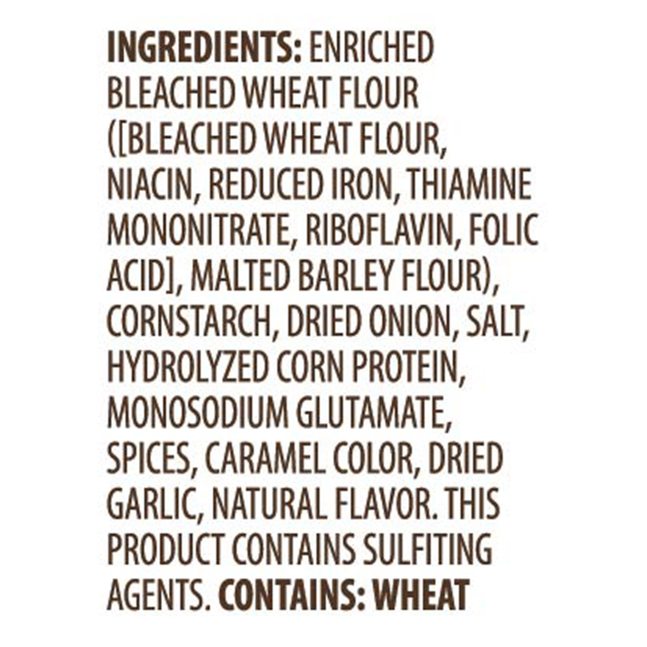 Enriched Bleached Wheat Flour ([Bleached Wheat Flour, Niacin, Reduced Iron, Thiamine Mononitrate, Riboflavin, Folic Acid], Malted Barley Flour), Cornstarch, Dried Onion, Salt, Hydrolyzed Corn Protein, Monosodium Glutamate, Spices, Caramel Color, Dried Garlic, Natural Flavor. This Product Contains Sulfiting Agents.