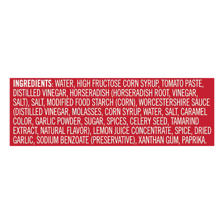 Ingredients: Water, High Fructose Corn Syrup, Tomato Paste, Distilled Vinegar, Horseradish (Horseradish Root, Vinegar, Salt), Salt, Modified Food Starch (Corn), Worcestershire Sauce (Distilled Vinegar, Molasses, Corn Syrup, Water, Salt, Caramel Color, Garlic Powder, Sugar, Spices, Celery Seed, Tamarind Extract, Natural Flavor), Lemon Juice Concentrate, Spice, Dried Garlic, Sodium Benzoate (Preservative), Xanthan Gum, Paprika.
