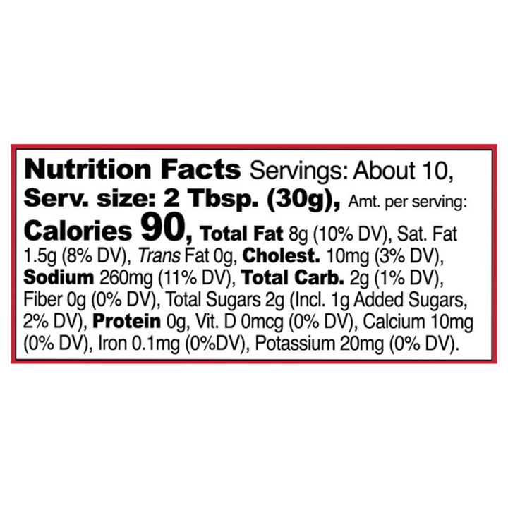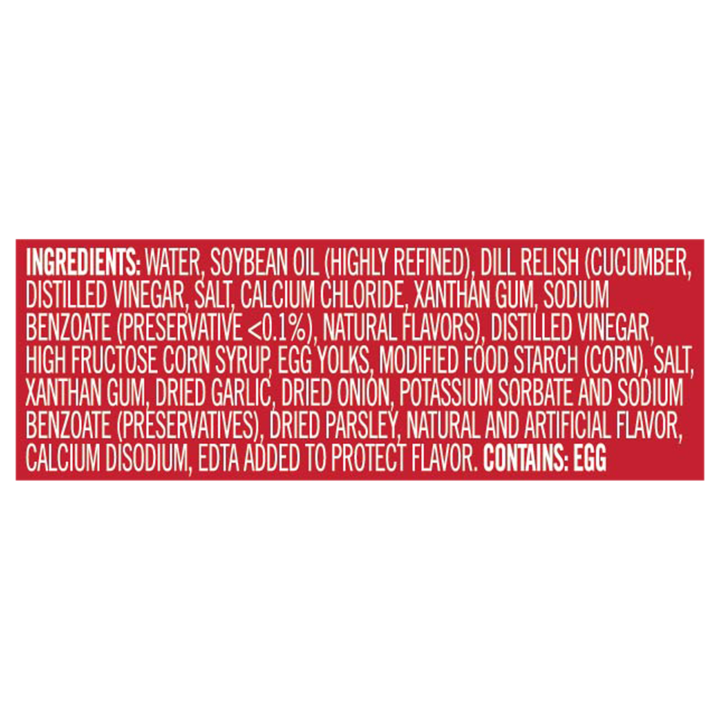 Water, Soybean oil (highly refined), dill relish (cucumber, distilled vinegar, salt, calcium chloride, xanthan gum, sodium benzoate (preservative <0.1%), natural flavors), distilled vinegar, high fructose corn syrup, egg yolks, modified food starch (corn), salt, xanthan gum, dried garlic, dried onion, potassium sorbate and sodium benzoate (preservatives), dried parsley, natural and artificial flavor, calcium disodium edta added to protect flavor. Contains: egg